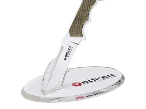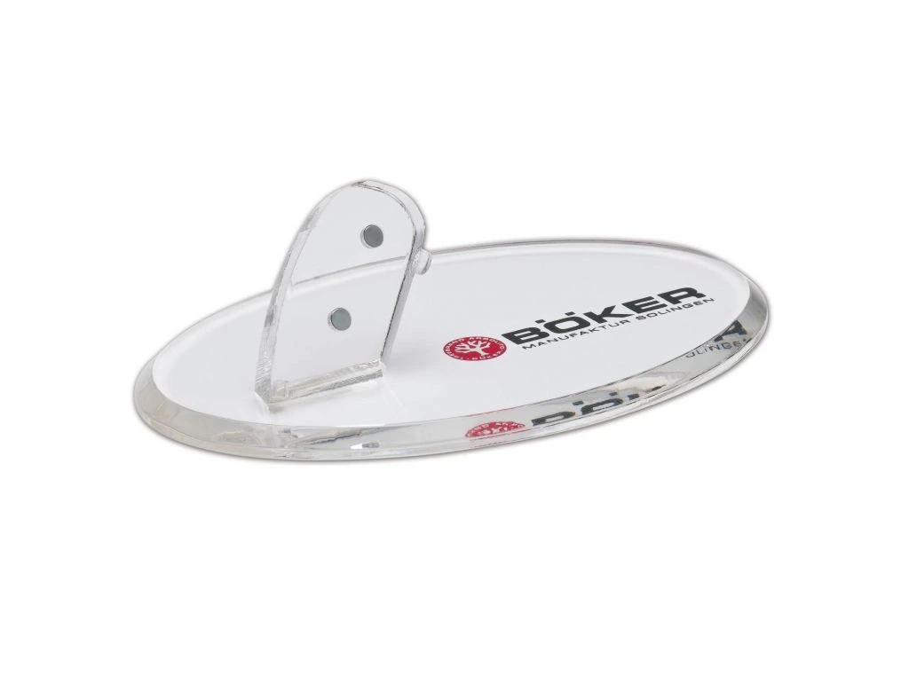 Der Acryl-Messerständer mit Böker Aufdruck hält ein Taschenmesser oder kleineres feststehendes Messer per Magnet und einer kleinen Haltenase zuverlässig in einer sehr schönen „Vitrinenposition“. Achtung: Bei ausgeprägt angeschliffener Fehlschärfe oder zu hohem Griffgewicht ist die Verwendbarkeit eingeschränkt. Grundplatte 15 x 10 cm. Höhe ca. 5 cm.