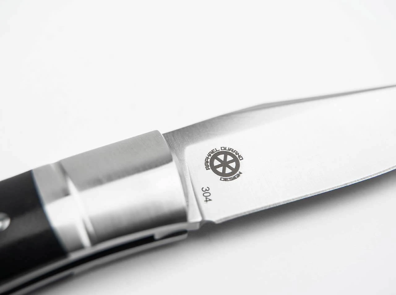 Der klassische Backlock vereint mediterrane Einflüsse bei der Klingenform mit denen eines traditionellen Taschenmessers und stellt so eine reizvolle Kombination dar, die eine einzigartige Ausstrahlung besitzt. Die Klinge wird aus N690 gefertigt und ist mit einem feinen Satin-Finish versehen. Die Edelstahlbacken tragen die für Raphaël Durand typische Nut. Die Beschalung besteht aus griffigem und stabilem Canvas-Micarta, das hier mit einem schönen gebürsteten Finish versehen ist.