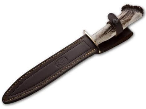 Der Hirschfänger Chevreuil von Muela ist mit einem Griff aus anmutiger Hirschkrone und einem dazu passenden Messing-Parierelement ausgestattet. Die einschneidige Klinge wird aus 4116 gefertigt, die hochwertige braune Scheide besteht aus Leder.