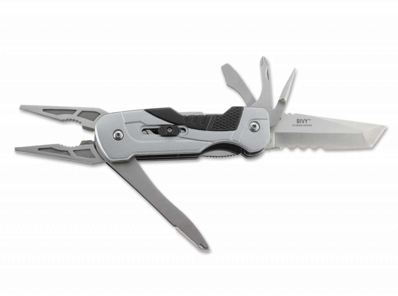 Nicht nur Extremkletterer schätzen ein Tool, das auch einhändig schnell zum Einsatz gebracht werden kann. So öffnet die Spitzzange auf Knopfdruck automatisch und ist sofort und ohne Verzögerung einsatzbereit. Die Tantoklinge mit Veff Flat Top Serrations öffnet per Daumenknopf manuell und verriegelt per Liner Lock. Zusätzlich bietet das Bivy einen Kreuzschlitzschraubendreher, einen Schlitzschraubendreher und einen Marlspieker zum Lösen von Knoten, wobei diese drei Werkzeuge ebenfalls arretieren und über einen zentralen Schieber auf der Griffschale entriegelt werden können. Mit Fangriemenöse.