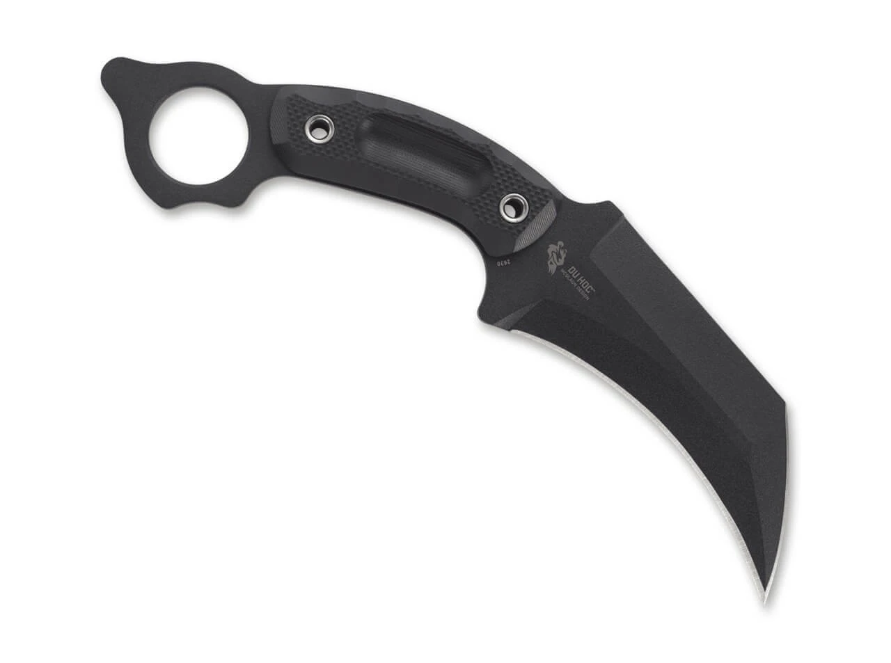 Austin McGlaun aus Georgia entwarf das CRKT Du Hoc zu Ehren seines verstorbenen Onkels, der während der Landung der Alliierten in der Normandie an der berüchtigten Steilküste kämpfte und für besondere Tapferkeit mit dem Silver Star ausgezeichnet wurde. Mit Hilfe von Ryan Johnson von RMJ Tactical wurde der vollkommen einsatztaugliche, robuste Karambit von der Spitze der gebogenen Klinge bis zum Ring am Ende des Griffes perfektioniert. Die beschichtete Klinge wird aus dem hochwertigen SK5 Kohlenstoffstahl gefertigt, ist an der Spitze beidseitig abgezogen und bietet eine überragende Stabilität. Der erhöhte Mangangehalt garantiert eine außergewöhnliche Härte und eine hohe Schnitthaltigkeit. Die stabilen G10-Griffschalen sind fein strukturiert und bieten auch bei schlechten Witterungsbedingungen optimale Griffigkeit. Die passgenaue GFK-Scheide kann mit dem beiliegenden Adapter am Gürtel oder der Ausrüstung befestigt werden.
