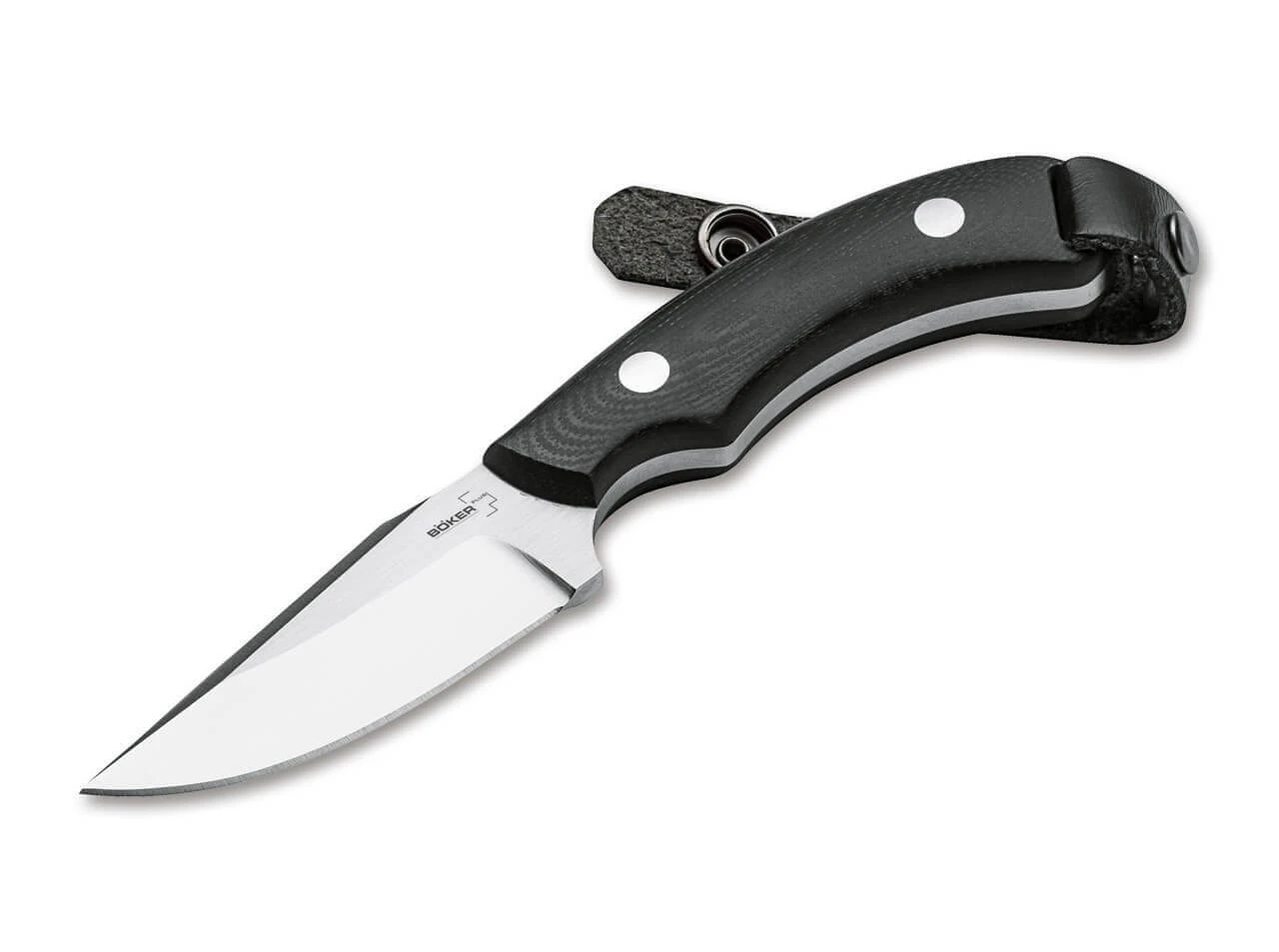Das von Greg Dash entworfene Böker Plus J-Bite ist ein überaus kompaktes EDC-Messer, das horizontal am Gürtel getragen wird und sich auch auf der Jagd oder in der Wildnis bestens bewährt. Der amerikanische Messermacher aus New York ist seit seiner frühen Jugend von Messern begeistert und stets auf der Suche nach praktischen Innovationen und Verbesserungen. Das handliche J-Bite ist mit einer satinierten Clip-Point-Klinge aus 440C ausgestattet, die mit einer dekorativen Fehlschärfe versehen ist. Der Griff aus schwarzem G10 liegt trotz seiner geringen Größe angenehm in der Hand. Um das Messer in der horizontalen Trageposition zu fixieren, entwickelte der Designer den sogenannten J-Lock. Ein Fangriemen am Griffende des Messers wird an der schwarzen Lederscheide befestigt und verhindert so ein ungewolltes Herausrutschen des Messers.