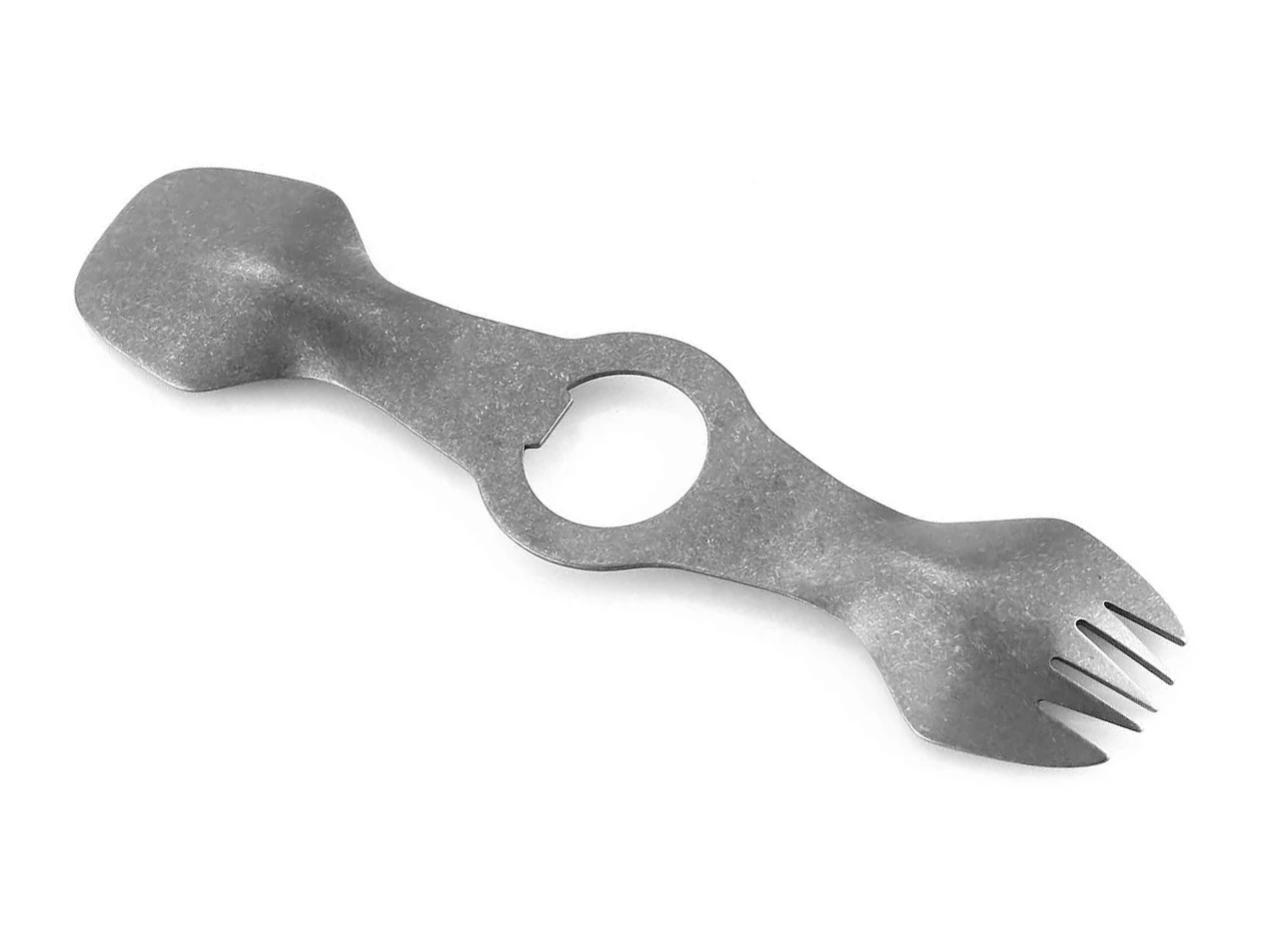 Titan-Campingbesteck mit Gabel, Löffel und integriertem Flaschenöffner.