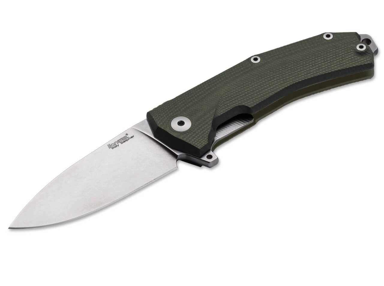 Ein handfester Einsatzfolder, der auch im Alltag oder im Outdoorbereich eine ausgezeichnete Figur macht, ist das KUR, nach dem Design von Molletta. Die massiv ausgeführte Droppoint-Klinge aus Sleipner–Stahl ist kugelgelagert und wird per Flipper geöffnet. Verriegelt wird die Klinge per Linerlock, wobei die Platinen und der Lock zur Gewichtsersparnis aus Titan gefertigt werden. Das ebenfalls aus Titan gefertigte Zwischenstück ist am Rücken mit einem Radius versehen und am Griffende sowohl als Schlagstück wie auch als Fangriemenöse ausgeführt. Die Beschalung aus olivgrünem G10 ist rutschsicher strukturiert und spart Gewicht. Klinge mit Stonewash-Finish.
