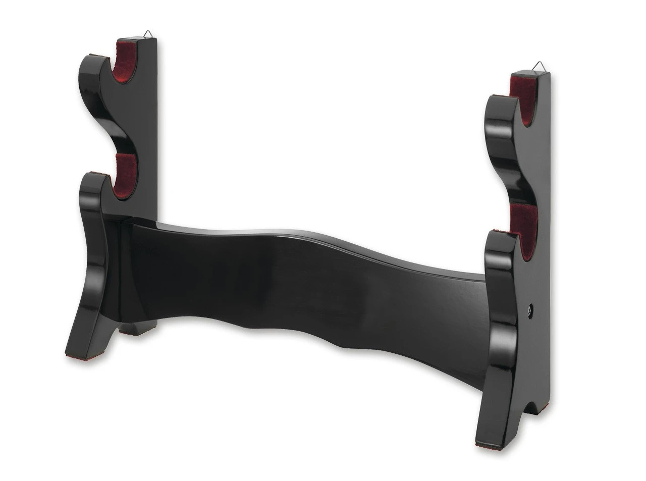Mit diesem aus schwarz lackiertem Holz gefertigten Schwertständer können Sie ein Daisho (zwei Schwerter) adequat präsentieren. Die Schwertaufnahme ist mit rotem Filz ausgekleidet, was Kratzer am Griff oder der lackierten Saya verhindert. Ebenso sind die Standfüße mit Filz versehen. Einschließlich Wandmontagemöglichkeit. B: 28,5 cm, H: 23,5 cm.