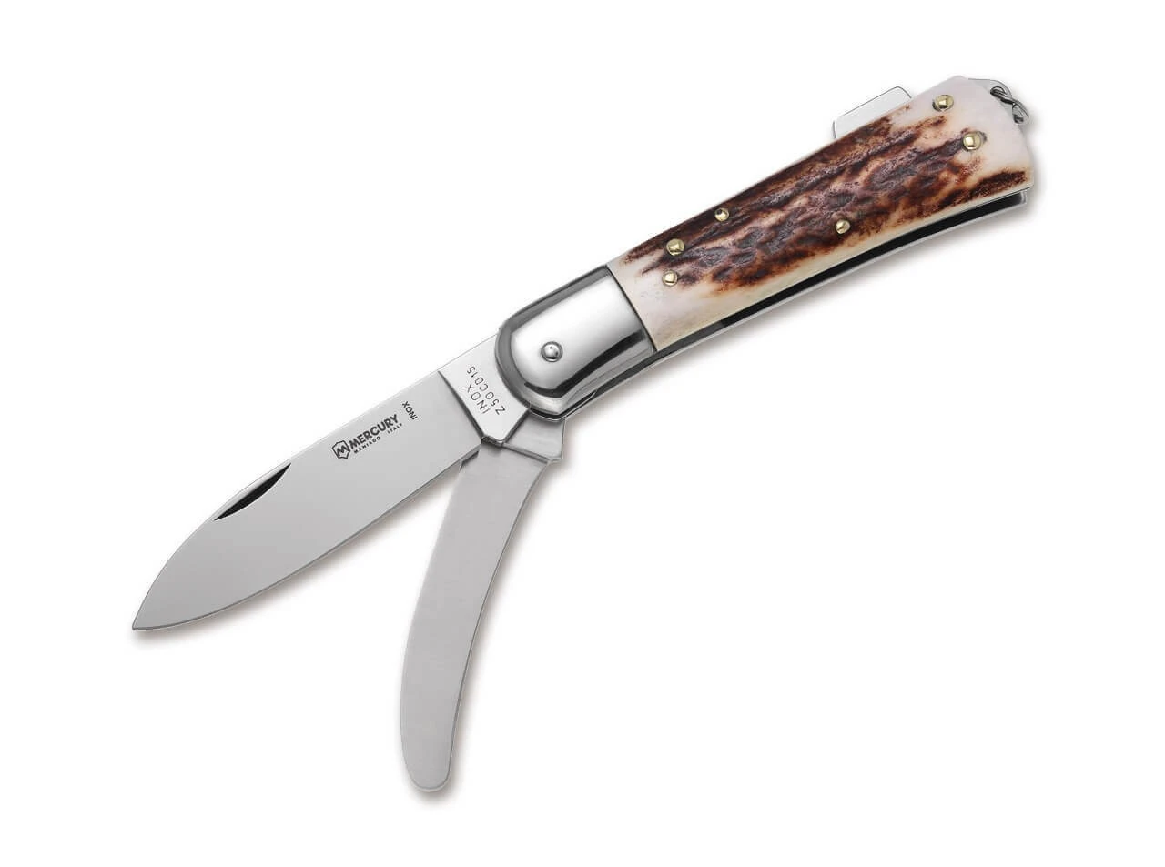 Die robust ausgeführte Hunting-Serie von Mercury ist mit einer drei Millimeter starken Hauptklinge aus Z50CD15 ausgestattet, die per Backlock arretiert und verfügt zusätzlich über eine Aufbruchklinge. Edelstahlerle und Edelstahlbacken unterstreichen den stabilen Charakter und machen das Hunting 980 zum perfekten Begleiter im Revier. Mit Griffschalen aus klassischem Hirschhorn und Fangriemenöse.