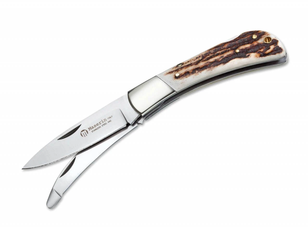 Im Bereich der traditionellen mehrteiligen Jagdtaschenmesser bietet Maserin mit dem Multiuso Caccia (Allzweckmesser für die Jagd) einen echten Klassiker. Mit Neusilberbacken, Hirschhornbeschalung, Hauptklinge und Aufbruchklinge. Klingenstahl 440 rostfrei.