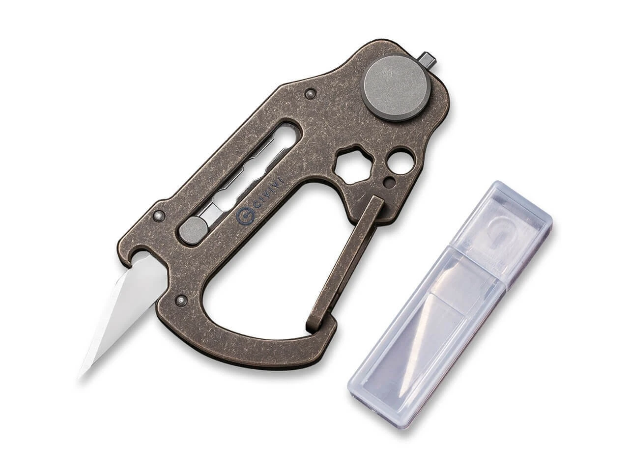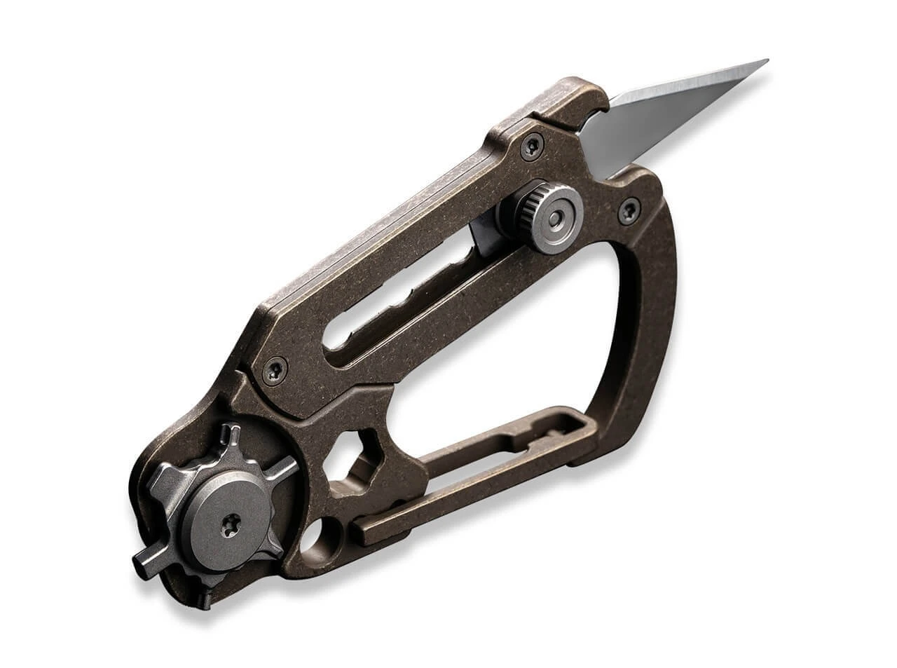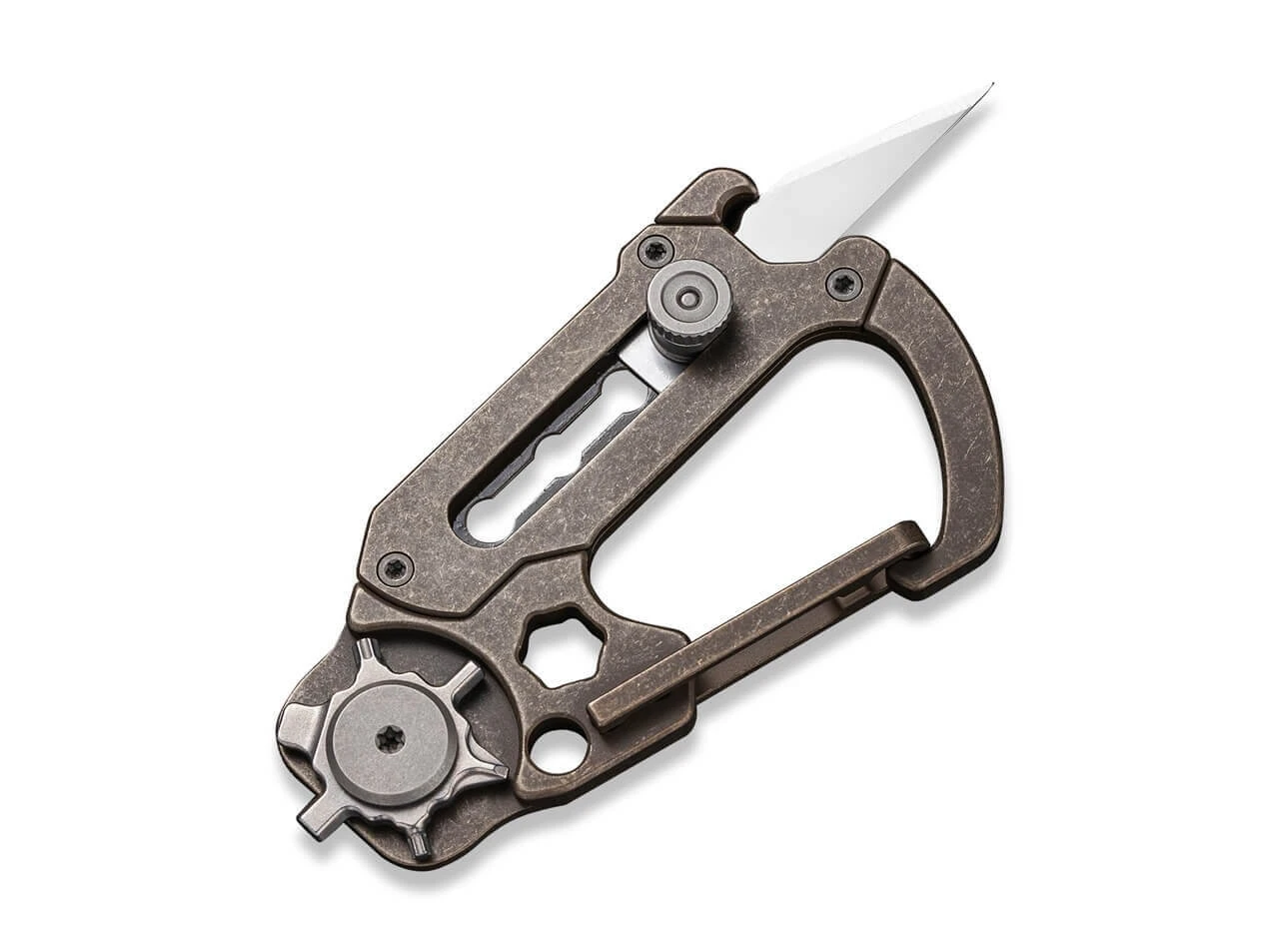 Hier ist der Name Programm. Das vielseitige und kompakte Multitiool hat viele Gesichter und präsentiert sich als praktischer Helfer im Alltag. Seine Konstruktion aus bronzefarbenem Titan enthält einen Karabiner sowie eine herausschiebbare Klinge aus 9Cr18MoV. Das kleine Rad im hinteren Bereich ist u.a. mit Inbus und Torx ausgestattet. Lieferung mit 3 Klingen.