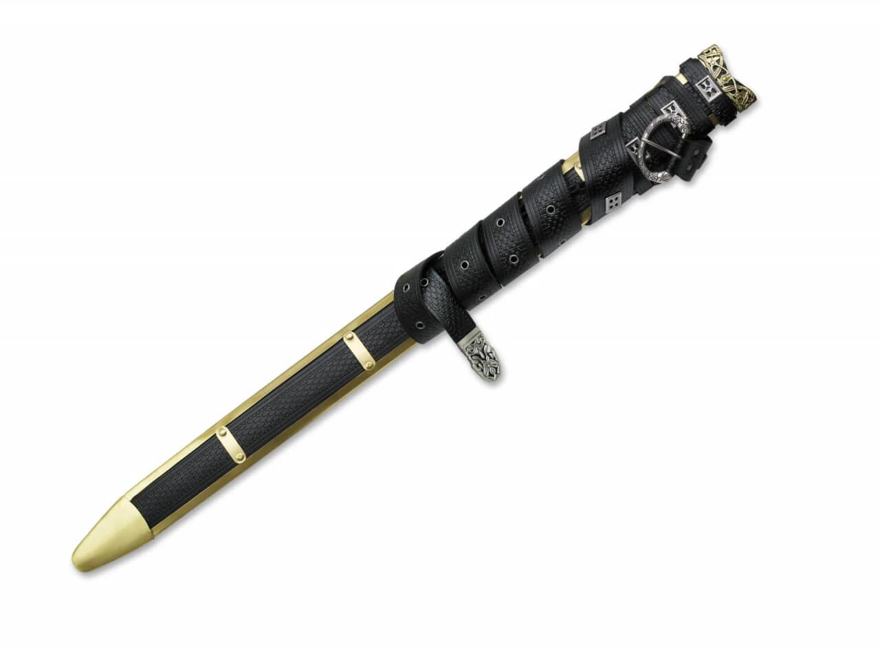 Die prunkvolle handgearbeitete Scheide des Schwertes Langklaue von Jon Schnee besitzt Applikationen aus echtem Leder und zahlreiche Metallteile und wird mit einem passenden Gürtel ausgeliefert. Länge ca. 93 cm