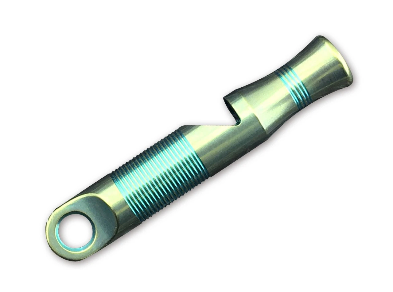 Nützliche Signalpfeife von WE Knife. Der Körper besteht aus grünem Titan.