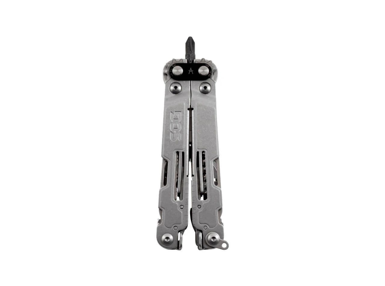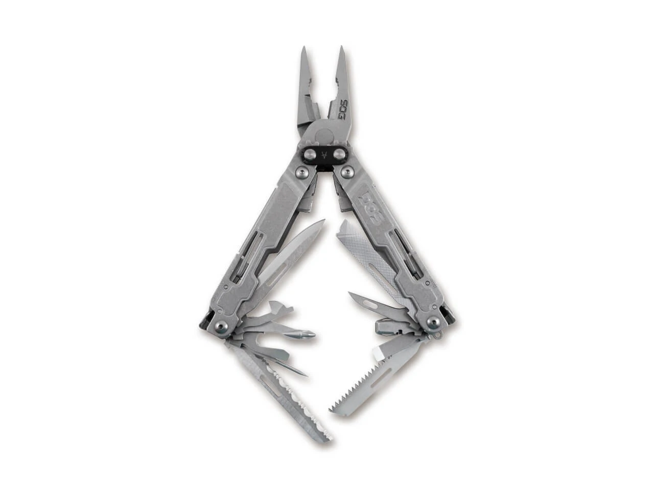 Das SOG PowerAccess Deluxe ist mit seinen 20 Funktionen das Produkt der Wahl, wenn man nach dem ultimativen Arbeitstier sucht. Eine massive Ganzstahlkonstruktion mit unverwüstlichem Stonewash-Finish und einer zuverlässigen Verriegelung für jede einzelne Funktion lässt keine Reserve unausgeschöpft. Das PowerAccess Deluxe enthält fast alle Werkzeuge der aktuellen SOG-Produktportfolios überhaupt. Der Zangenkopf mit der bewährten kraftsteigernden Zahnkranzübersetzung enthält vorn die flache Greiffläche als Spitzzange, dann das sogenannte Brennerloch zum Greifen von Außensechskantschrauben, Rohren und Überwurfmuttern, sowie die Schneidfläche mit Hart- und Weichdrahtschneider. Weiterhin sind im großzügigen Umfang enthalten: Mittelspitze Messerklinge mit glattem Schliff (7 cm), Sheepfoot-Klinge mit Wellenschliff (7 cm), Holzsäge (7 cm), Dreiseitenfeile, Phillips-Schraubendreher # 1, Stech- und Bohrahle, Feinmechaniker-Schraubendreher, Schlitzschraubendreher (klein und mittel), Hex-Bit-Halter (1/4“), Schaber bzw. Holzmeißel, Lineal in Inch und Zentimeter, Dosen- und Flaschenöffner, sowie Fangriemenöse. Im Lieferumfang ist außerdem ein Cordura-Gürteletui, welches das Tool und Bits aufnehmen kann.