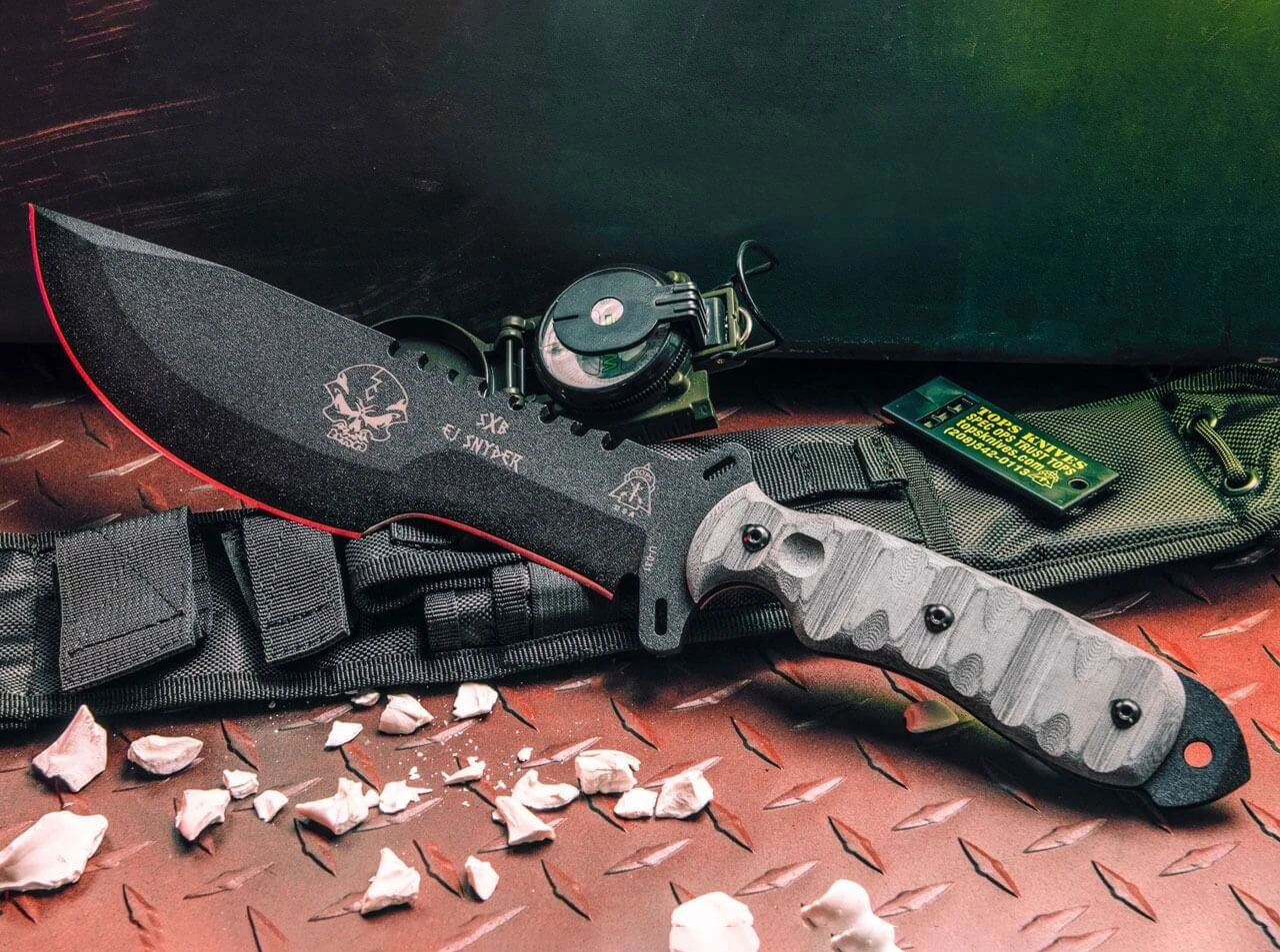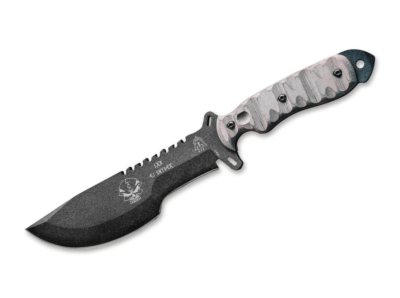 Das TOPS SXB ist ein zuverlässiges Überlebensmesser, das sowohl für die Wildnis als auch für den militärischen Einsatz konzipiert wurde. Entworfen wurde das eindrucksvolle Outdoormesser von EJ Snyder, einem hochdekorierten Armeeveteran, Überlebenskünstler und Abenteurer. Das robuste, langlebige Skullcrusher’s Xtreme Blade ist mit einer beschichteten Klinge aus 1095 Kohlenstoffstahl ausgestattet. Die strukturierten Griffschalen bestehen aus Micarta und liegen dank ihrer ergonomischen Form stets sicher in der Hand. Mit hochwertiger Nylonscheide.