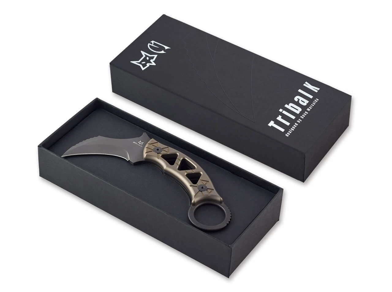 Ein Karambit ohne Kompromisse – das feststehende Fox Knives Tribal K greift die Gene der klassischen fernöstlichen Messer auf und würzt diese mit der nötigen Bissigkeit. Die schwarz beschichtete Klinge aus N690 ist mit einer Wave ähnlichen Daumenauflage ausgestattet und langt kraftvoll zu. Der Griff aus bronzefarbenem Titan ist mit gewichtsreduzierenden Aussparungen sowie einer Verzierung versehen, die an Tribal Tattoos erinnert. Der typische Karambit-Ring rundet das charakterstarke Profil ab.