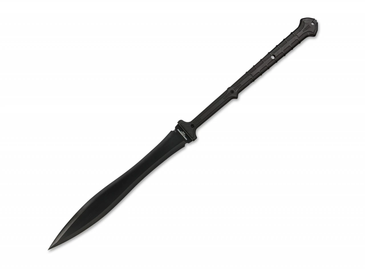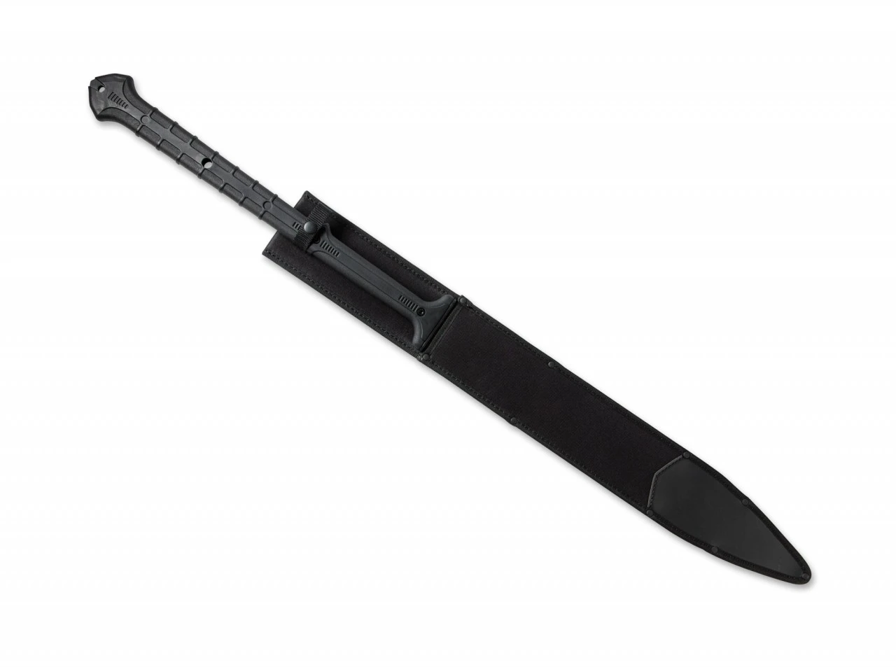 Mit diesem außergewöhnlichen Schwert ist man für sämtliche Eventualitäten gewappnet. Die schwarze, scharfe Klinge aus 1065 Kohlenstoffstahl bietet ausreichende Flexibilität bei hoher Schnitthaltigkeit. Die Griffschalen sind aus glasfaserverstärktem Kunststoff gefertigt. Eine Nylonscheide und ein Tragegurt sind im Lieferumfang enthalten.