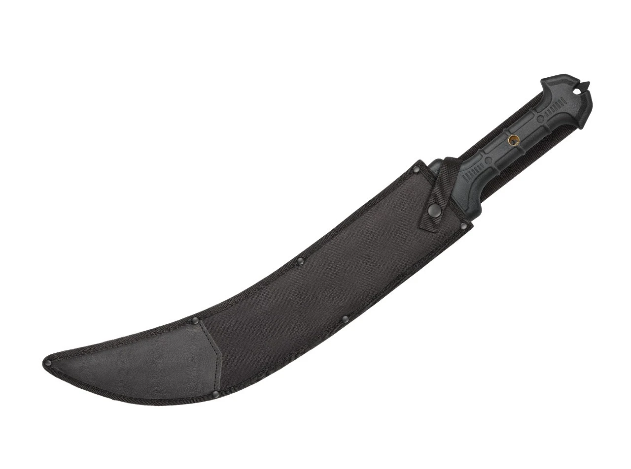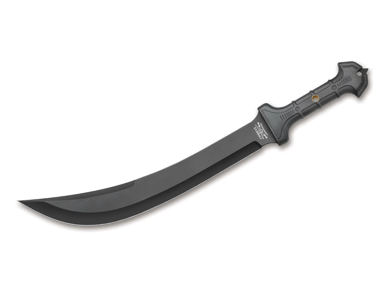 Das Thrax Gladius von United Cutlery beindruckt durch eine wuchtige, gebogene Klinge aus schwarz beschichtetem, schockelastischem 1065 Kohlenstoffstahl. Die vollständig durch den strukturierten TPR-Gummigriff im römischen Gladius-Stil laufende Angel ist am Ende in einen Schlagdorn ausgeformt. Das Thrax Gladius kann sicher in der mitgelieferten verstärkten Nylonscheide transportiert werden.