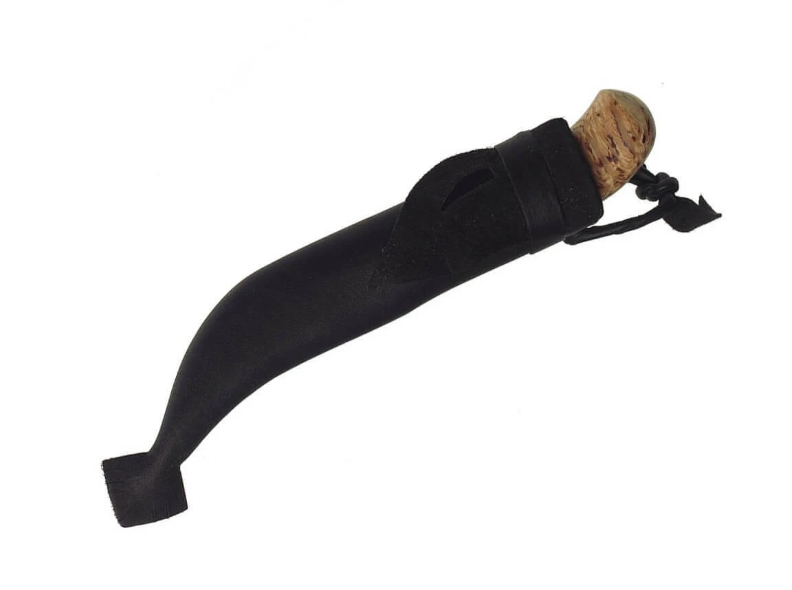 Giron ist der Name eines in Lappland heimischen Vogels, der im Winter ein helles Gefieder bekommt. Und so ist das Karesuando Giron nun mit einem Griff aus heller Maserbirke und Rentierhorn ausgestattet, dessen Knauf den Vogelkopf nachempfindet und für die ausgezeichnete Handlage sorgt. Lieferung mit klassischer samischer Lederscheide mit Durchstichschutz und flexibler Riemenbefestigung.